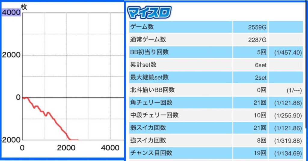 なんだよ、初当たり1/457で単発5回に2連が1回って…うち1回は33枚だし。ケンシロウ弱すぎてザコにも勝てんくなったか?🥴