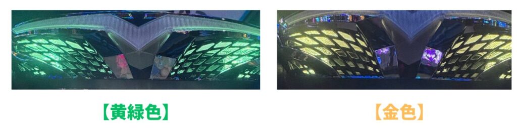 見てもらうと分かると通り、黄緑と金の違いはすぐに分かります。他に黄色ポイ点灯パターンがないので黄色みたいなのが金色です!