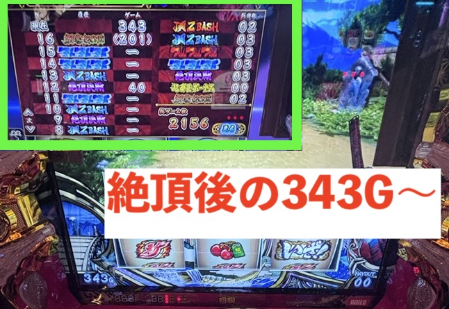 絶頂後はチャンスA以上に移行。最大600G天井になるので250G辺りから狙えます