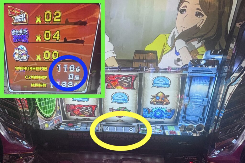 はい、それでは初打ち!新台初日なので無理やりAT後の118Gから打っていきますが…