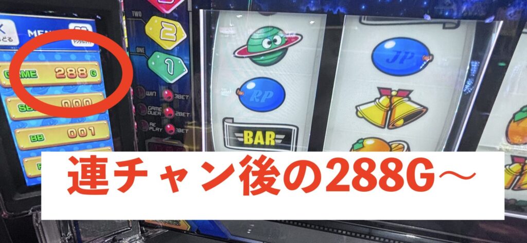また、この台は朝イチ350G ➡︎ 70Gと連チャンした後なので、もしかすると朝イチは連チャン準備状態に移行しやすい。見たいなのがあるかも?