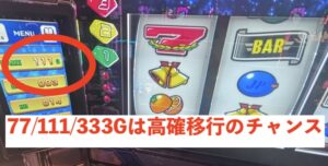 第3停止の音が遅れると高確を示唆。(遅れ後30G以内に発生すると高確濃厚)発生時はしばらく様子を見ましょう