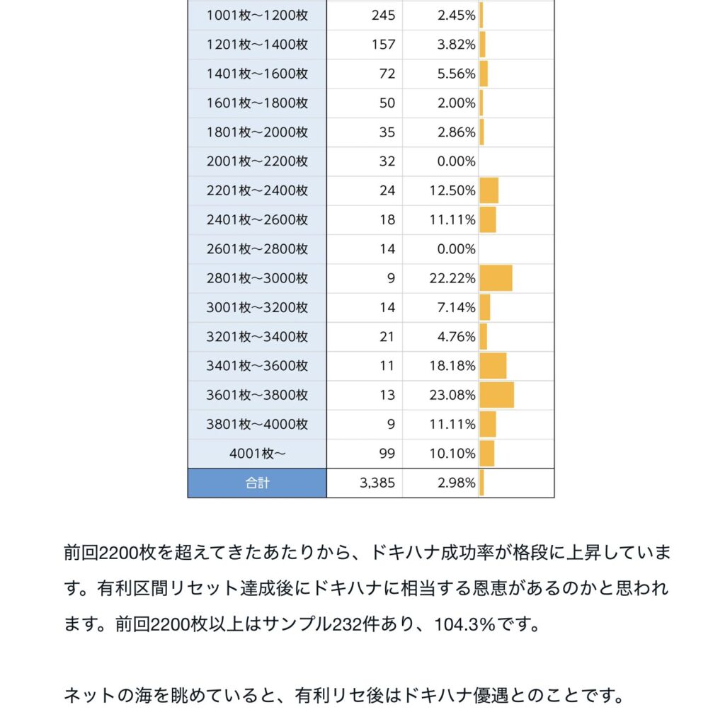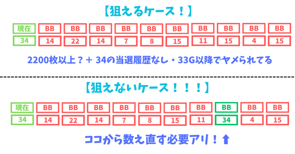 このケースはそこでドキハナを成功しているので、34Gを起点に改めて枚数を数える必要があります!