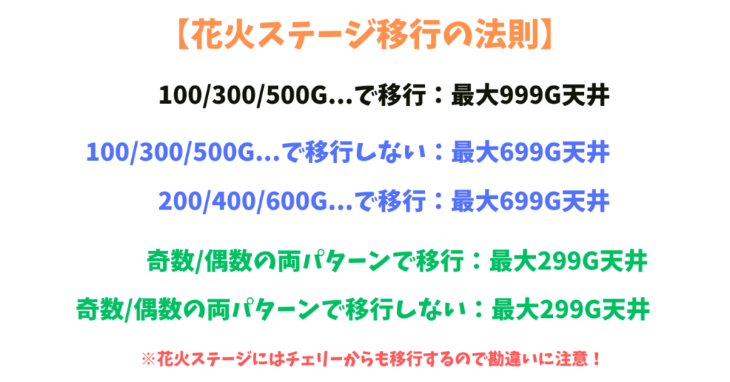 花火ステージにはレア役(主にチェリー) or 規定ゲーム数で移行するのですが今回注目するのは規定ゲーム数からの移行です