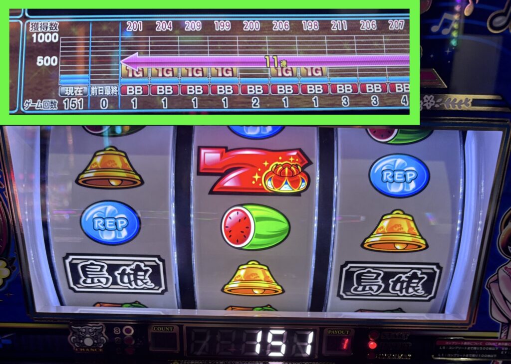 この台の狙いはBIG後の350G天井!200G付近を目安にボーナス当選まで打ちます