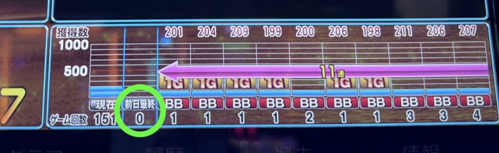 このホールのカウンターは前日に回っていても“当たりが0回であれば0Gで表示”されます