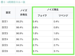 ノイズは高設定ほど発生しやすく、(3・4周期目は)発生さえすれば50%でリベンジフリーズが起きます