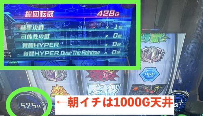 朝イチは液晶600G辺りかな。CZ未当選であれば200G辺りから狙って、液晶ゲーム数で押し引きする感じなりそうですね